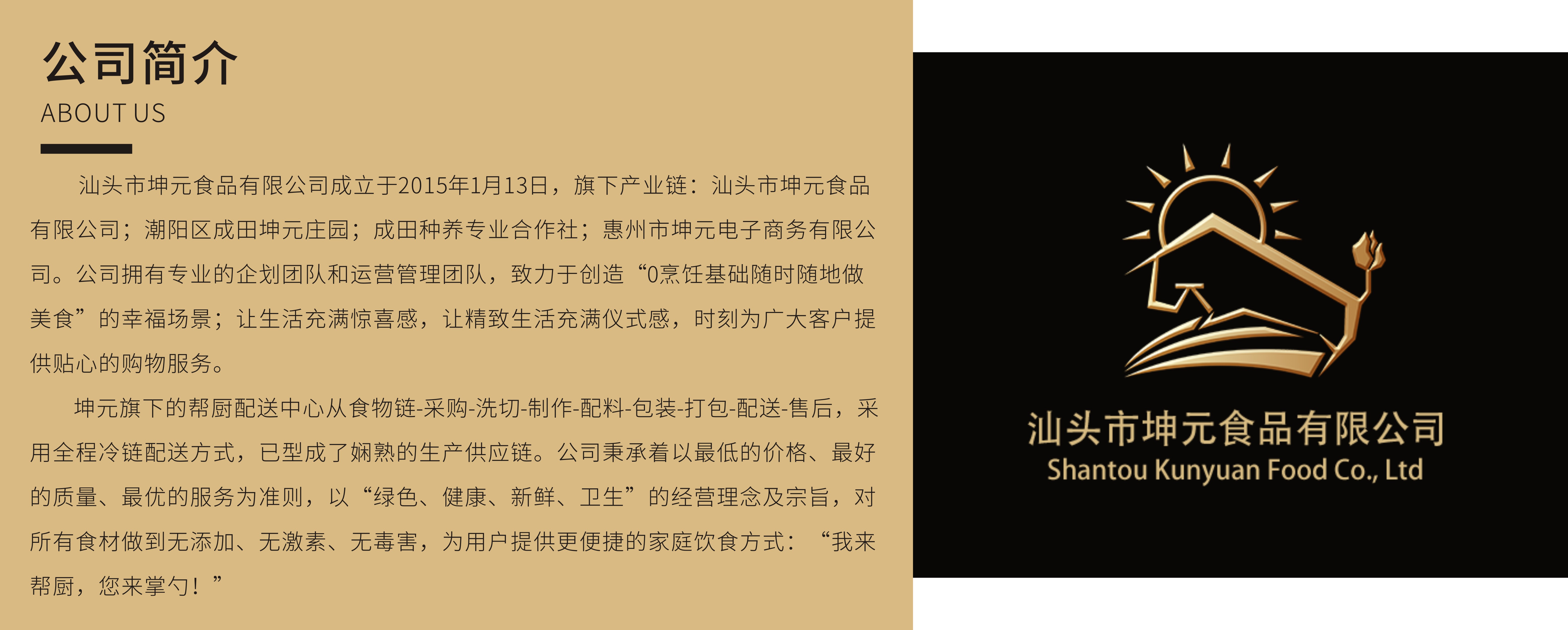 坤元幫廚配送中心致力于創(chuàng)造“0烹飪基礎(chǔ)隨時(shí)隨地做美食”的幸福場(chǎng)景;讓生活充滿驚喜感,讓精致生活充滿儀式感,時(shí)刻為廣大客戶提供貼心的購物服務(wù)。從食物鏈-采購-洗切-制作-配料-包裝-打包-配送-售后,采用全程冷鏈配送方式,已型成了嫻熟的生產(chǎn)供應(yīng)鏈。公司秉承著以最低的價(jià)格、最好的質(zhì)量、最優(yōu)的服務(wù)為準(zhǔn)則,以“綠色、健康、新鮮、衛(wèi)生”的經(jīng)營(yíng)理念及宗旨,對(duì)所有食材做到無添加、無激素、無毒害,為用戶提供更便捷的家庭飲食方式:“我來幫廚,您來掌勺!”